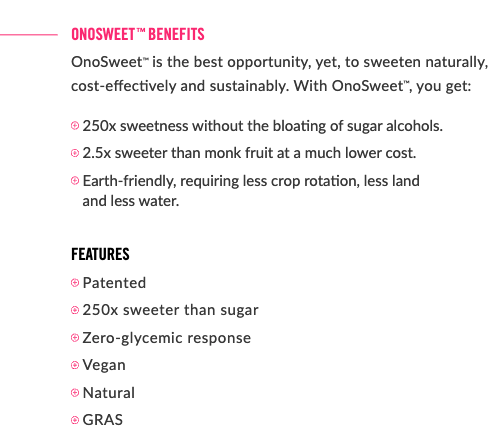 - OnoSweet® (Reb M from rice) starts clean, builds steadily, and finishes rich with no bitterness – the more OnoSweet® you add the sweeter it becomes!